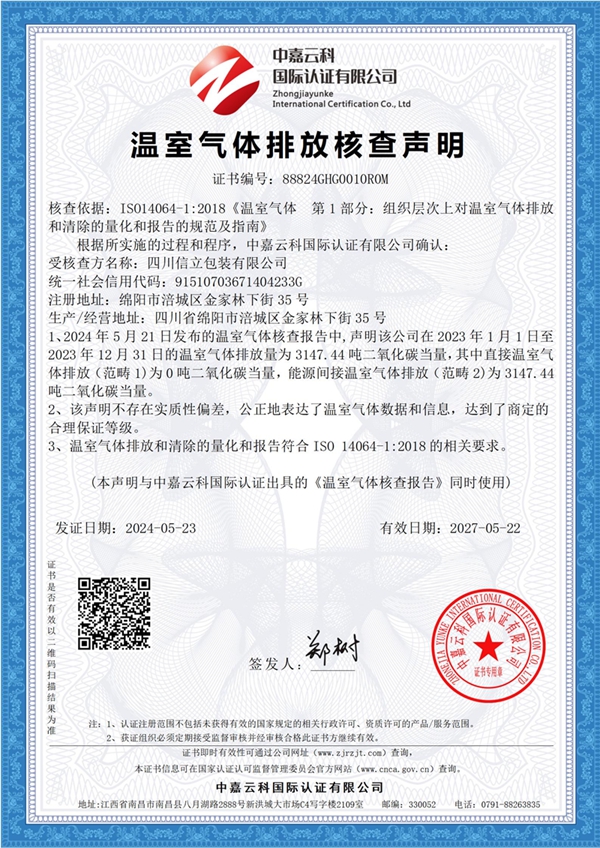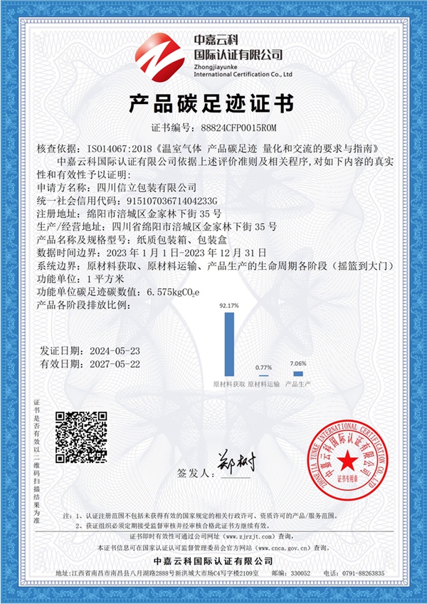 根据企业发展需要,现对CFP:纸质包装箱、包装盒的生命周期的产品碳足迹;GHG:组织边界范围内【四川省绵阳市涪城区金家林下街35号的乐竞网页版登录入口】所涉及的温室气体碳排放管理相关活动等相关认证核查予以公示,接受社会监督。